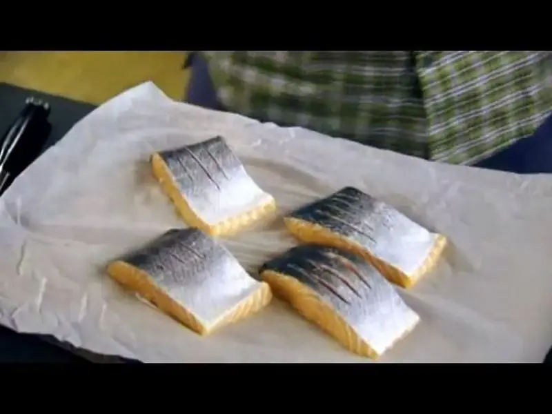 - 2Snijd de zalm 3 keer in de lengte in op de huid. (ongeveer 1 cm diep)