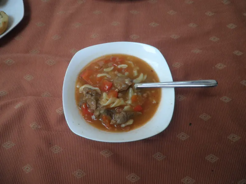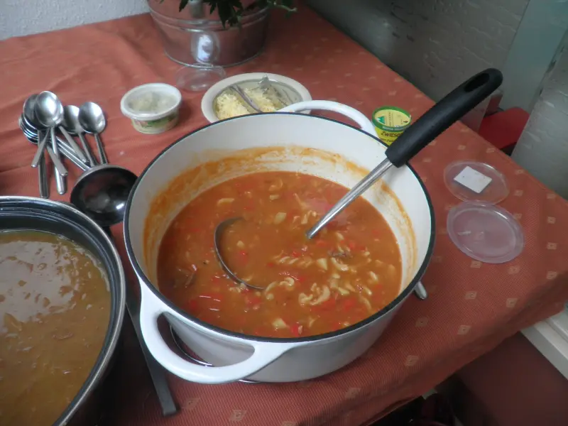 - 7Bouillonblokjes toevoegen en na 1,5 uur handje (droge)pasta.