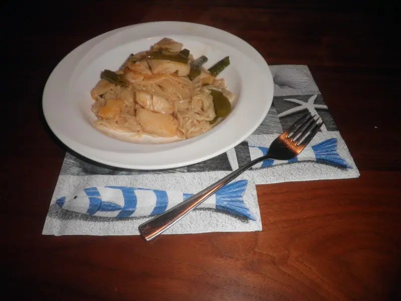 - 2Stukken vis erdoor en 1 à 2 minuten meebakken. Vis heel voorzichtig met spatel omscheppen. Chilisaus, 1 eetlepel citroensap en eventueel ketjap manis erdoor en dan de sugarsnaps toevoegen. Al omscheppend nog even doorwarmen.